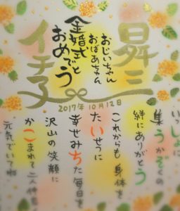 201710/15 筆文字お名前ポエム 色紙 ブログ お誕生日のお祝い色紙と金婚式のお祝い色紙お書きしました(^^)。リピーターのお客様です。ありがとうございますm(__)m。 今日は一日雨だったので家の中でした。先週奈良の道の駅でさつまいもをたくさんかったのでスイートポテト作りました。