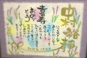 家族のお名前ポエム、喜寿お祝い筆文字お名前ポエムお書きさせていただきました。喜寿は紫のカラーなのでラベンダーのお花お描きしました(^^)。とても仲良しのご家族のようで、すごくいいなあと思いました。