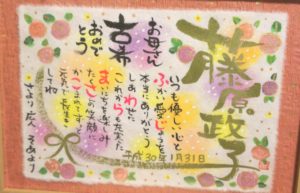 古希と米寿のお祝い筆文字お名前ポエムお書きさせていただきました。お花お描きしました。シュナウザーのワンちゃんお描きしました(*´ω`*)。素敵なお祝いになりますように心から願っています。