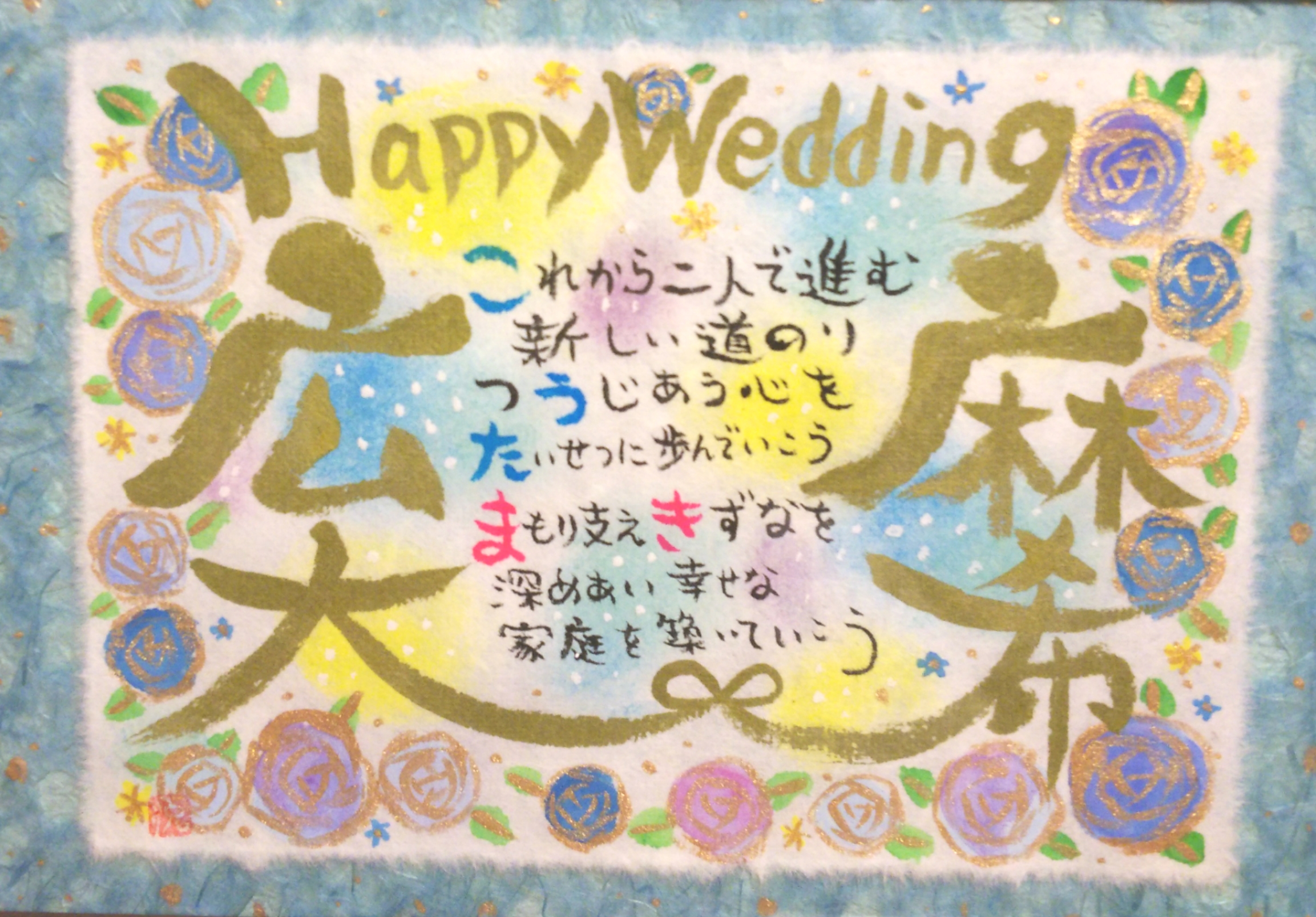 お子様に書かせていただきました。ポエムの中に虹をおいれしましたので、虹の絵もお描きさせていただきました。全体的にふわっとした優しい印象にしたいなと思いました(^^)。書かせていただき感謝します。