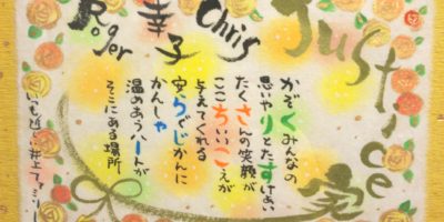 家族の筆文字お名前ポエムお書きさせていただきました。外国の方のお友だちに贈られるようで、ウキウキしながらお書きさせていただきました。 ありがとうございます。笑顔いっぱいの家庭を願っています。 ちょこちょこ合 …