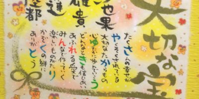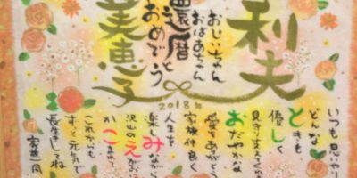還暦のお祝いに筆文字お名前ポエムお書きさせていただきました。 お花はお任せでしたのでバラとかすみそうです(*´ω`*)。素敵なお祝いになりますように🍀 今日は昔からの友達が家に来てくれて楽しいひとときを過ごしました。息子 …